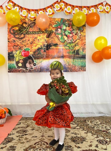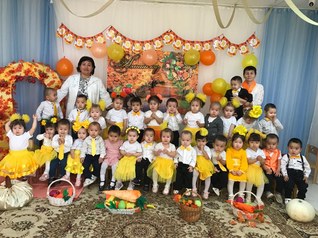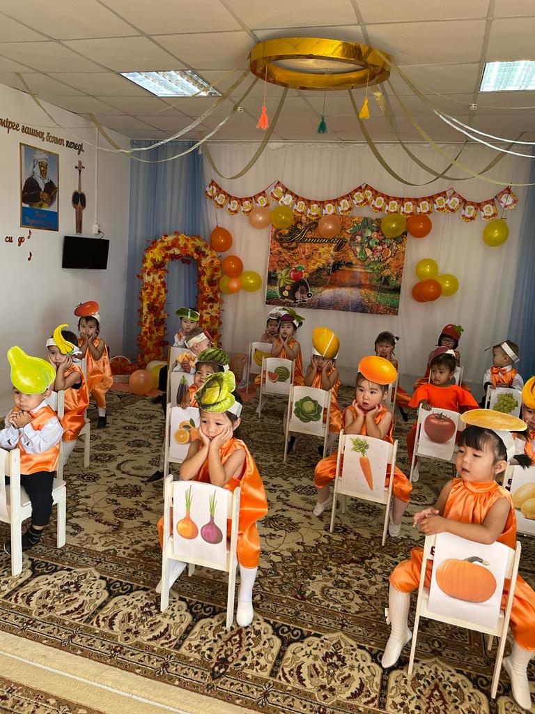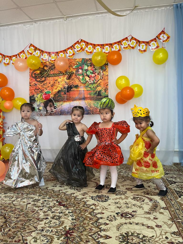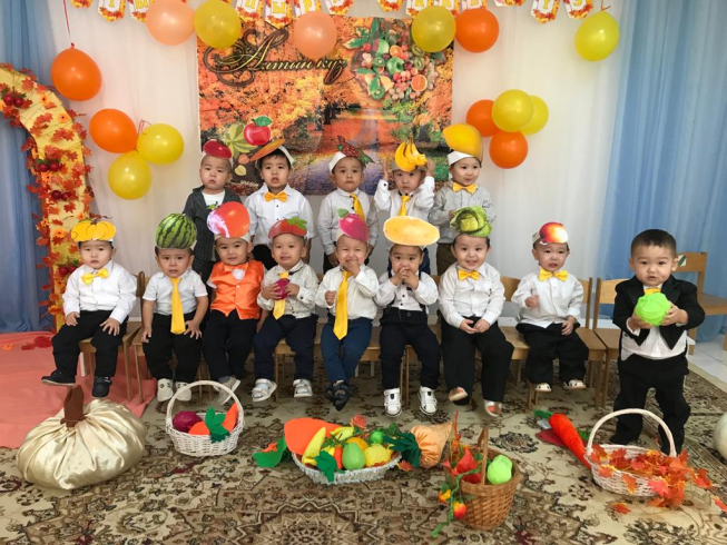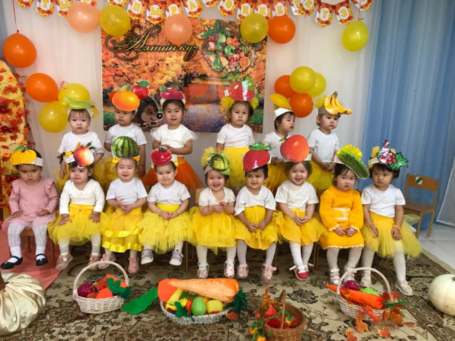 «Ай» тобының тәрбиешісі Қ.Б.Жаналиева “Қош келдің Алтын күз” атты ертеңгілігінде, балаларға көкөніс пен жеміс – жидекті ажырата бөліп, себеттерге салдырып, балалардың бастарына қағаздан қиылған жемістер мен көкөністерді киіп,топқа бөлінді. Бақта, бақшада не өсетіні туралы мағлұмат берді. Алтын күз туралы әндер айтылып, би қимылдары жасалды.