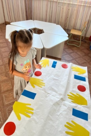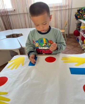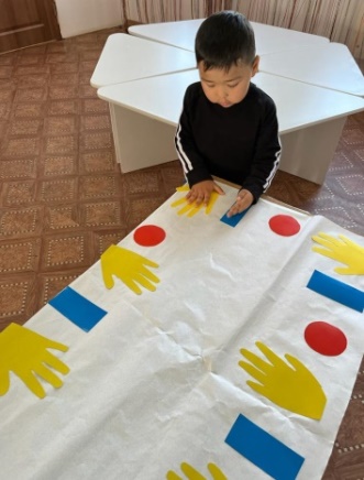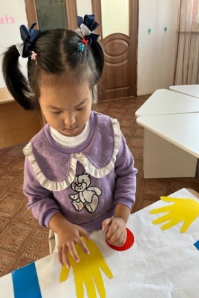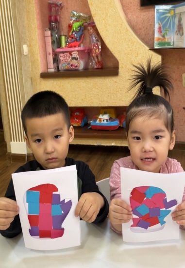 «Шуақ» тобының тәрбиешісі Л.Е.Кусаинова балаларға өздеріне ыңғайлы әдемі жарасымды қағаз бетіндегі қолғаптарын қалаған түрлі түсті қиынды қағаздарымен әшекейлеп жапсыртты.