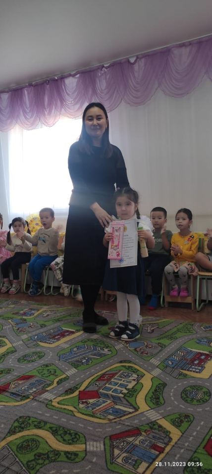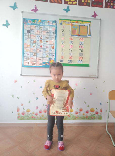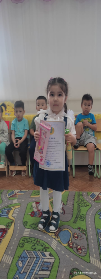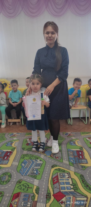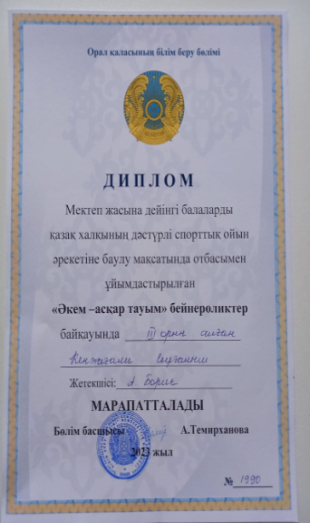 Қазақ халқының дәстүрлі спорттық ойын әрекетіне баулу арқылы мектеп жасына дейінгі балалардың денсаулығына және салауатты өмір салтына деген қызығушылықтарын,белсенділігін қалыптастыру мақсатында Қазақстан Республикасы Оқу-Ағарту минстрлігі «Балаларды ерте дамыту институты»республикалық мемлекеттік мекемесінің 2023 жылға арналған жұмыс жоспарына сәйкес «Әкем –асқар тауым» сырттай байқауына «Гүл» тобының тәрбиеленушісі Кенжеғали Сырғалым және «Шуақ» тобының тәрбиеленушісі Ержанова Ясина жүлделі ІІІ орындарға ие болды. Жетекшілері «Гүл» тобының тәрбиешісі Борис Ақжонас Берікқызы және «Шуақ» тобының тәрбиешісі Кусаинова Лунара Ермековна