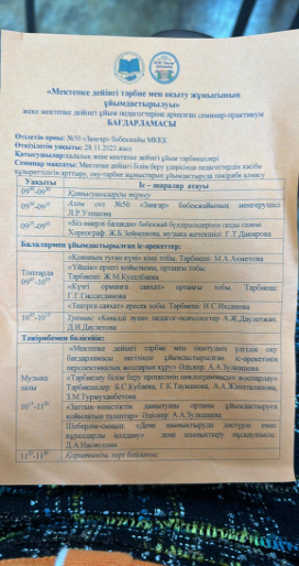 №50 «Заңғар» бөбекжайында «Мектепке дейінгі тәрбие мен оқыту жұмысының ұйымдастырылуы» атты тақырыбында жеке мектепке дейінгі ұйым педагогтеріне арналған семинар-практикумына «Гүл» тобының тәрбиешісі Муфтуллина Айсана Жасенбайқызы қатысып келді.