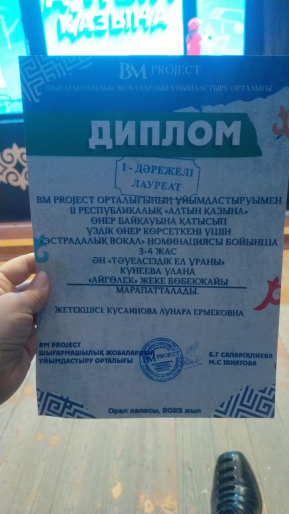«Шуақ» тобының тәрбиеленушісі Кунеева Улана ІІ Республикалық «Алтын қазына» өнер байқауына 3-4 жас аралығындағы, «Эстрадалық вокал» номинациясы бойынша «Тәуелсіздік ел ұраны» атты әнімен байқауға қатысып, жүлделі І ші Дәрежелі Лауреат Дипломымен кішкентай өнерпазымызға статуэтка табыс етілді, сонымен қатар жетекшісі Кусаинова Лунара Ермековнаға және «Айгөлек» бөбекжайының ұжымына Алғыс хаттар берілді.