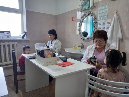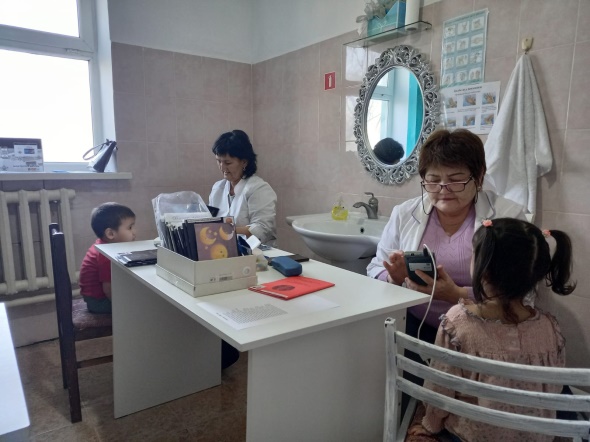 №3 емхананың Лор дәрігерлері келіп, балалардың құлақтарын аппаратпен тексерді.