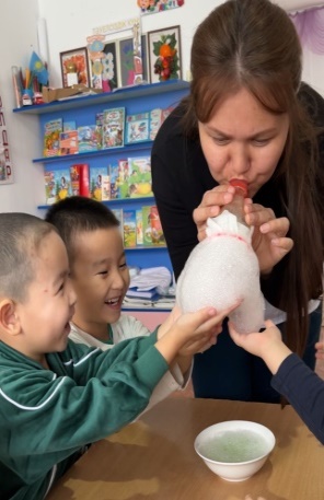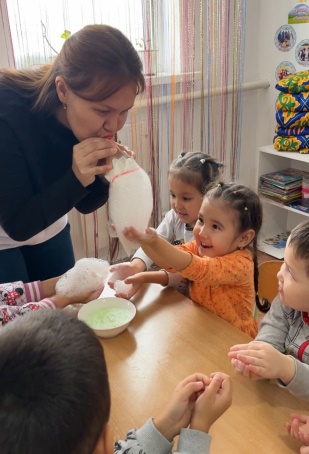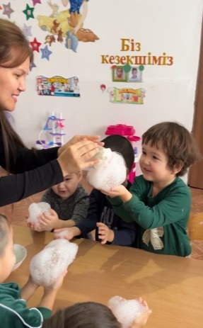«Гүл» тобының тәрбиешісі А.Б.Борис тәжірибе жасау арқылы сабын көпіршіктері туралы түсініктерін кеңейту. Табиғат сырларын танып білуге баулу. Зерттеу әрекеттерін, құралдарды ұқыптылықпен ұстау дағдыларын қалыптастыру.Өз беттерімен және бірігіп жұмыс істеуге қарым — қатынастарын қалыптастыру мақсатында «Сабынды көпіршіктер» атты тәжірибе жасап көрсетті.