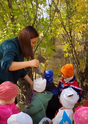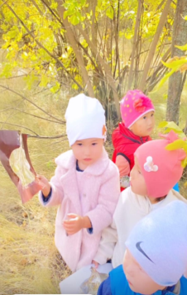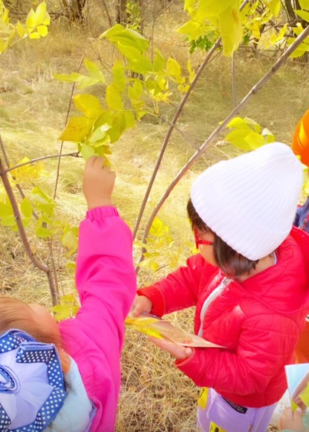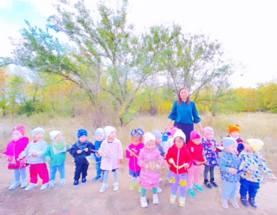«Шуақ» тобының тәрбиешісі Л.Е.Кусаинова күзгі табиғат құбылыстарымен таныстыра отырып, күзгі ағаштарға назарларына аудару. Күзгі ағаштардың ерекшелігімен таныстыру. Табиғатқа деген сүйіспеншіліктерін арттыру. Күзгі табиғаттың сұлулығы мен әсемдігін көре білуге тәрбиелеу мақсатында «Күзгі ағаштарды бақылау» тақырыбында тобымен серуенге шықты.
