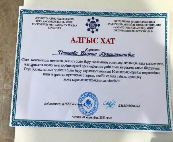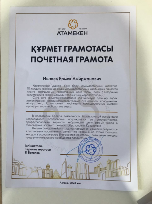 Бөбекжай құрылтайшымыз Иштаев Ермек Амиржановичке тореалқа төрағасы Р.Балтаевтан «Құрмет грамотасын» алып, және бөбекжай директоры Иштаева Фарида Куанышкалиевнаны Елордамыз Астана қаласында өткен «Қазақстанның үздіксіз білім беру қауымдастығының» 10 жыл толуына орай ҚҮББҚ басшысы Л.И.Куленова төсбелгісін тағып, куәлік және Алғыс хатпен марапаттады.
